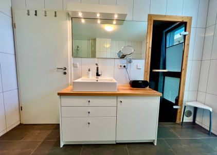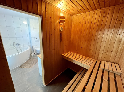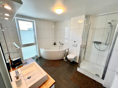 Das große Wellnessbad mit Sauna und Wohlfühleckbadewanne laden nach einem Strandtag oder nach sportlichen Aktivitäten zum Entspannen ein.