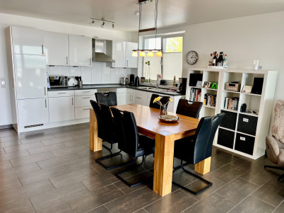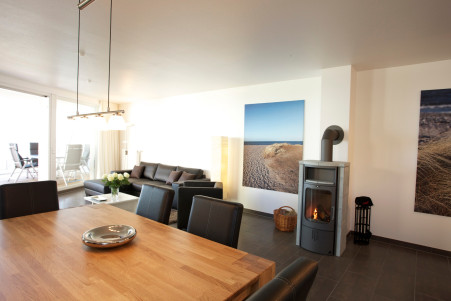 Der große helle Wohnraum mit Kaminofen, Essbereich und offener Küche ist stilvoll und ganz auf die Bedürfnisse unserer Gäste eingerichtet. Vom Wohnraum haben Sie Zugang zur großen und teilweise überdachten Terrasse, von der Sie einen traumhaften Meerblick haben. Die Terrasse ist nach Süd-Osten ausgerichtet.